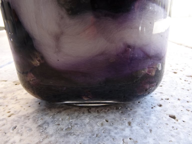 Da ich gerne mit Materialmix arbeite, habe ich Seide, Seide-Wolle und verschiedene Wollsorten in ein Glas mit getrockneter Schwarzer Malve geschichtet. Das Ergebnis hat mich erstaunt, denn der vorerst Lila-Farbton hat sich recht verändert. Entstanden sind khaki-schlamm-graue Farbtöne, die Materialien haben die Farbe ziemlich unterschiedlich aufgenommen. Ein paar Tagetes haben den gelben Schimmer hinzugefügt, insgesamt war ich sehr angetan von dem unerwarteten Ergebnis.
