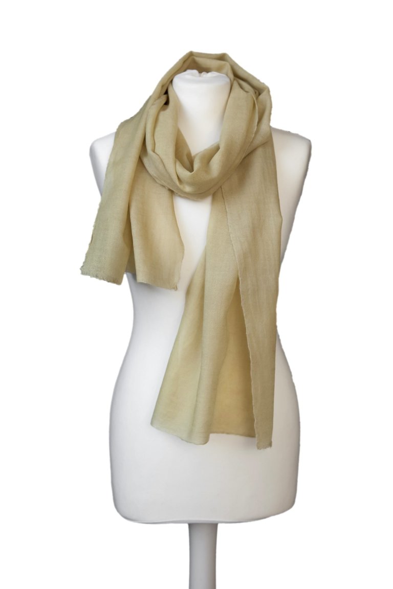 Ein handgefärbter weicher Wollschal aus extrafeiner Merinowolle, gefärbt mit Walnuss. Der Schal zeigt melierte Farbtöne in hellem Braun.